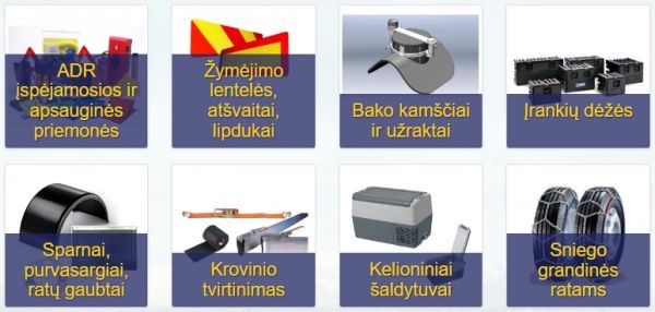 Priemonės krovinio tvirtinimui, ADR įspėjamosios ir apsauginės priemonės. Įrankių dėžės, sparnai ir purvasaugiai, sniego grandinės ratams ir ratų gaubtai. Žymėjimo lentelės, atšvaitai, lipdukai, bako kamščiai ir užraktai, tachografų juostelės ir diskeliai.